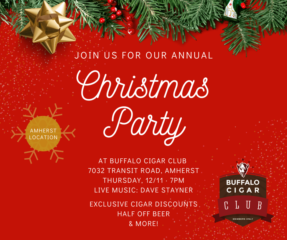 Don’t miss our annual Buffalo Cigar Club Christmas party at the Amherst location on 12/11. Free food, cigar deals & discounts, and more!