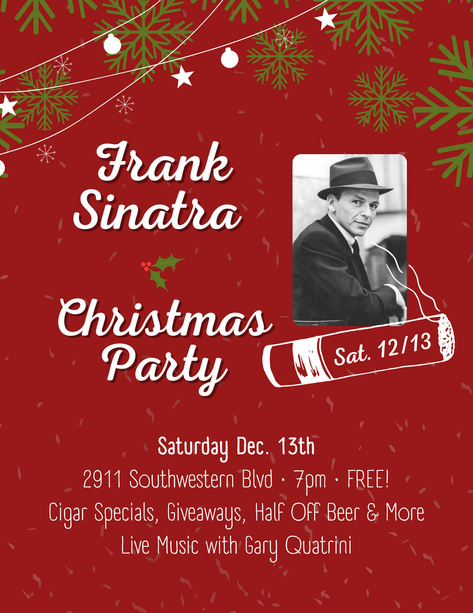 Come celebrate the life of one of the greatest celebrities of all time: Frank Sinatra! Join us as Gary Quatrani brings to life timeless classics while enjoying free refreshments and fine cigars.